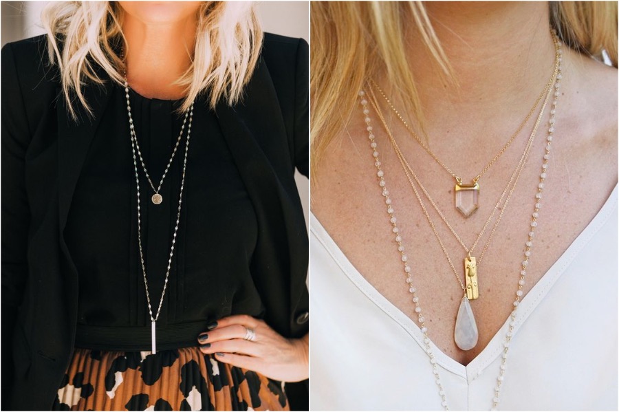 Another good way to elongate your neck and slim down your top part is to wear long jewellery. It will draw attention downward, and create a v-shape that will make you appear slimmer. It’s also a nice way to direct the attention towards your face instead of any other body part. Wearing a long layered necklace has a similar effect. And the same goes for bracelets that draw attention to your wrist which is the slimmest part and focus it there instead of upper arms.