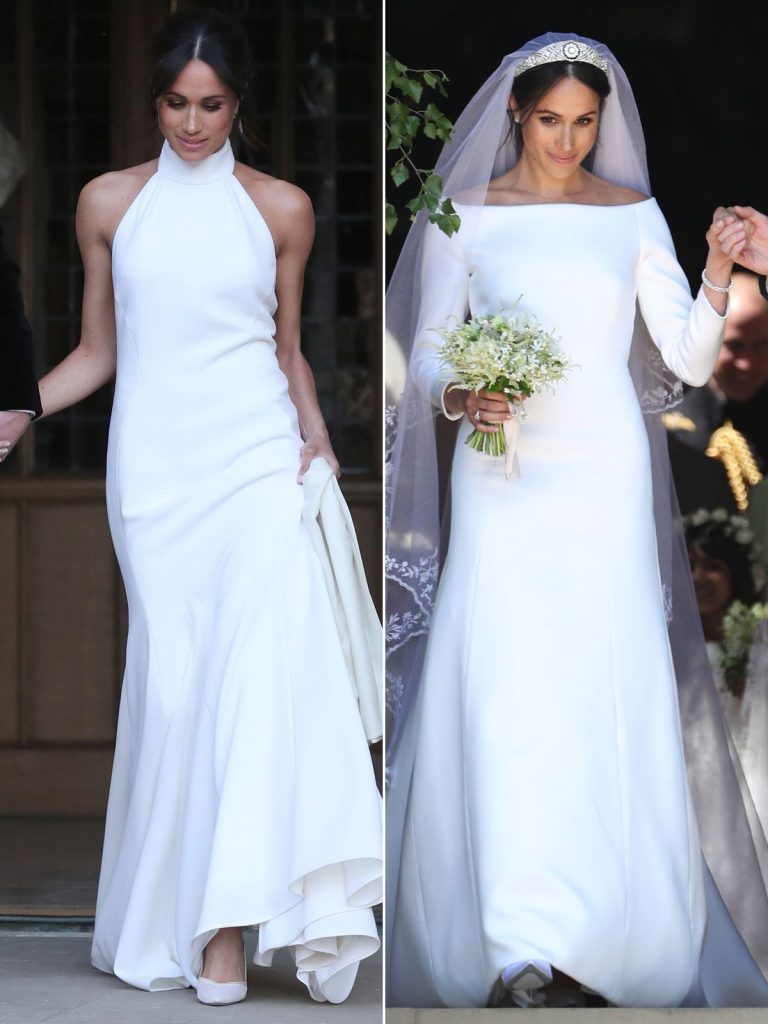 2. Here, they both wear floor-grazing white ensembles. Kate opts for lace and a traditional pleat, while Meghan instead is wearing wide-legged pants and a top with some sheer detailing. Once again, Meghan goes for a more modern and cutting-edge aesthetic.