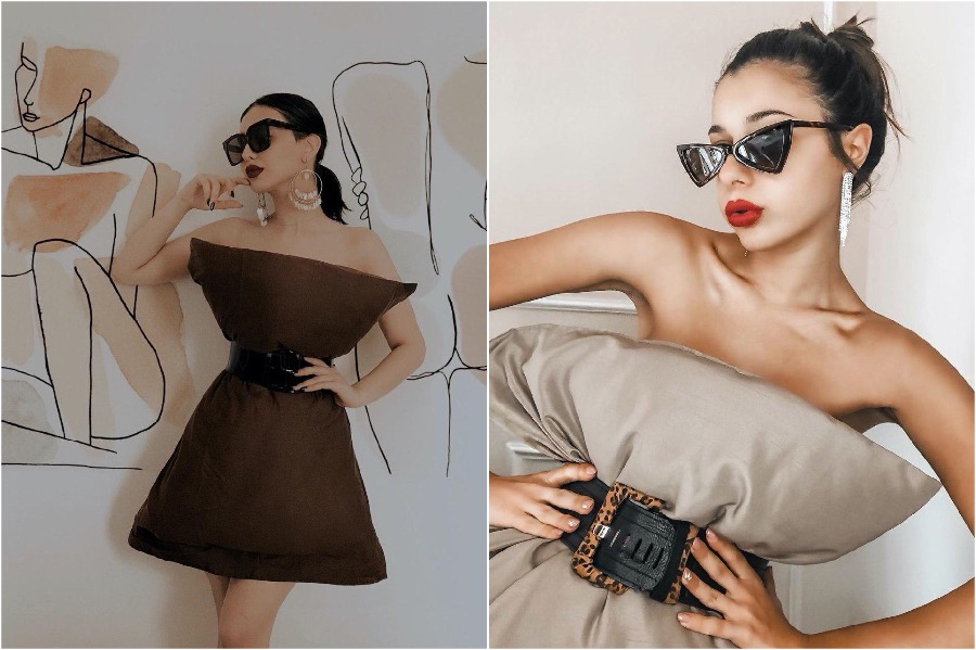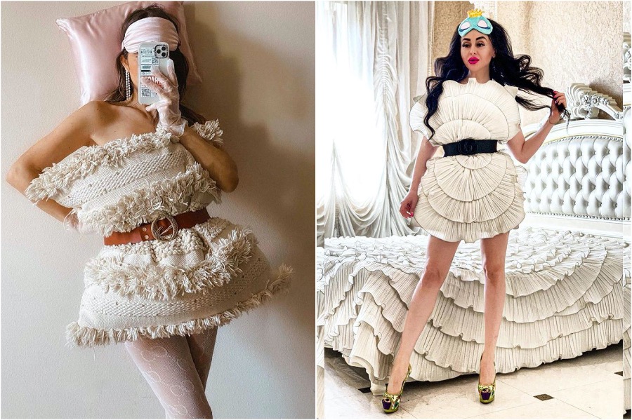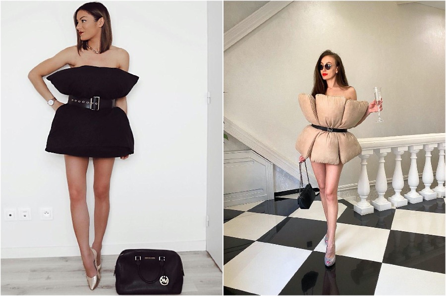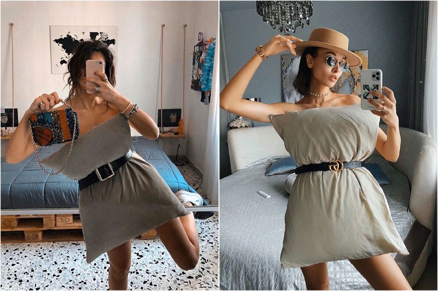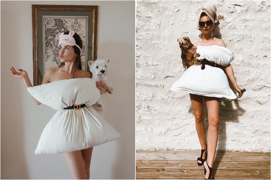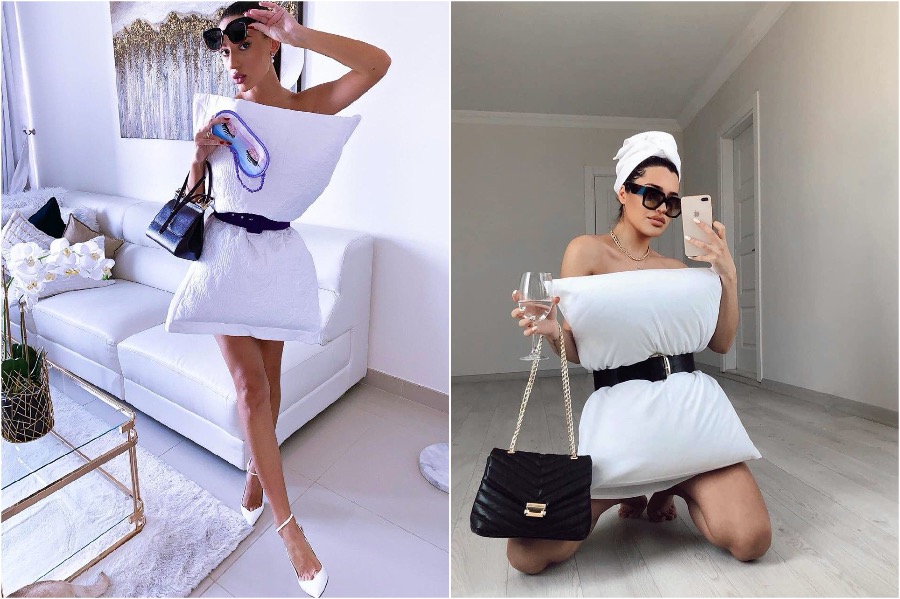 To join the challenge by attaching a pillow to yourself with a belt, accessorize the best you can and take a photo to post on Instagram with #quarantinepillowchallenge. Feel free to use this impromptu at-home fashion photo shoot as an excuse to put on some makeup, do your hair, maybe even wear heels. I mean, this is the new sexy, clearly. And while a white pillow is becoming a classic, like a quarantine version of a little black dress, we really love those rebels who are playing with color and texture, it really adds to the look.