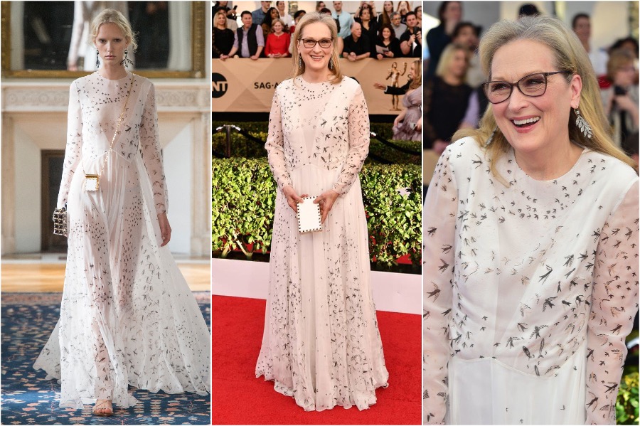 The model at the Valentino spring collection show is giving us very different vibes than the ones we get from Meryl Streep at the SAG awards the same year, and yet they both look good in that dress, just in vastly different ways.