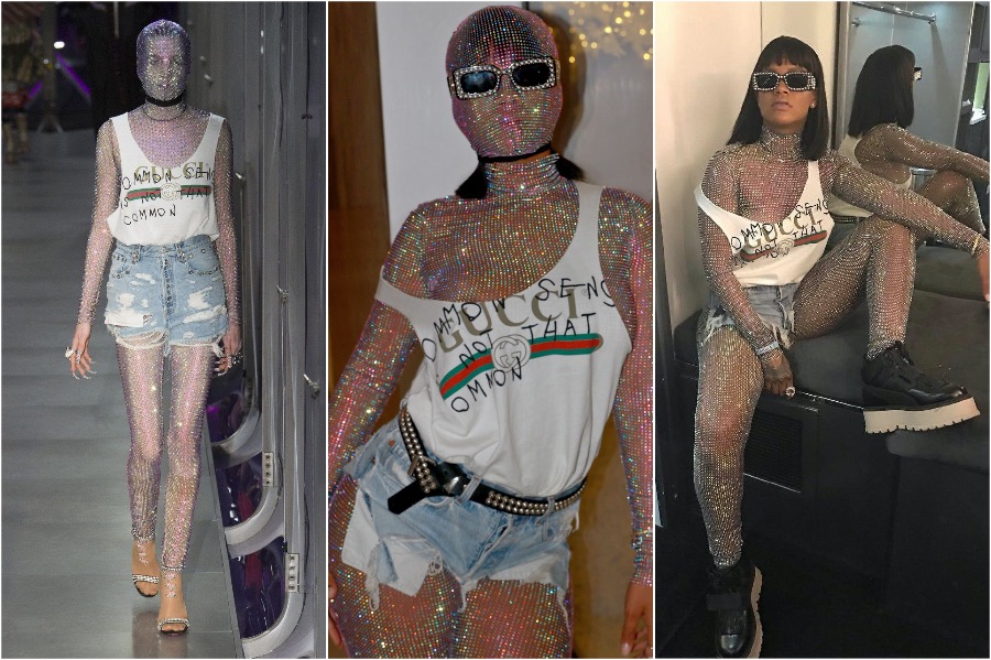 Rihanna can pull off any look, that’s just a fact. But we still think it looks so much better without the weird mask thing. However, you’ve got to agree it’s quite a strong look and Rihanna pulls it off with such ease.