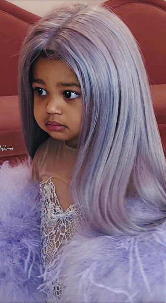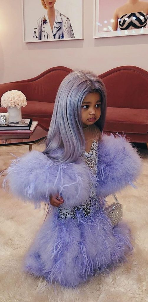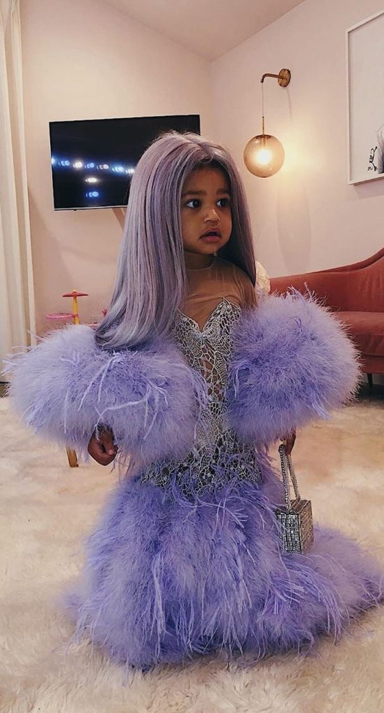 Kylie’s original Met Gala dress was very intricate and a one-of-a-kind creation. It included a Versace mesh gown made of crystals and ostrich feathers. According to sources, Versace’s designer seamstresses worked by hand on this stunning original piece for 30 days. As complicated as Kylie’s original gown was, Stormi’s version was a near replica, complete with a a mini but almost identical mesh crystal bodice, purple wig, and sleeves covered in dainty, purple feathers. Her look was complete with a purple bejeweled handbag.