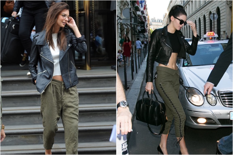 9. This is the classic example of them wearing essentially the same thing but styling it differently. Both are wearing khaki pants and a leather jacket, except Emily’s outfit, is more chill and laid back and Kendall, as per usual is going for a more glam look.