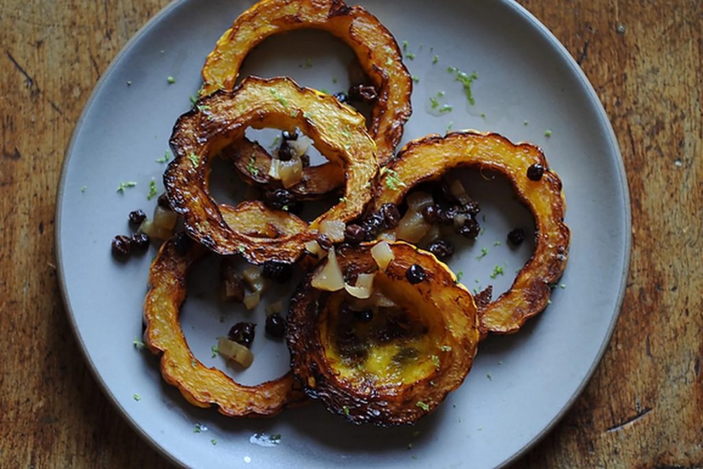Vegetarian or not, these nutritious and flavorful squash rings are a great addition to any Thanksgiving table, brightened up with some lime, apple relish, and current, along with the complex flavors of fennel. Best of all, you don’t need to peel this squash before you cut and prep it!
