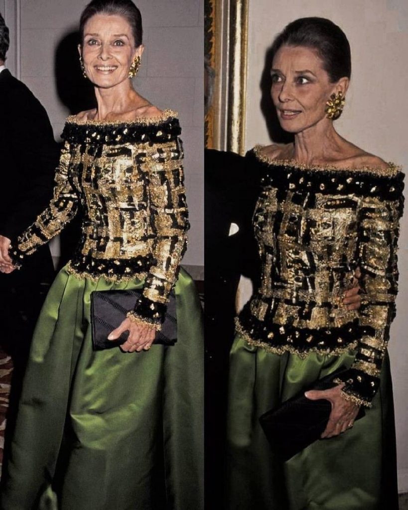 7. Audrey’s style definitely grew and changed with her. This is a dress she wore to a benefit in the early 90s and it’s definitely bright and eye-catching with that green skirt and black and gold bodice details.