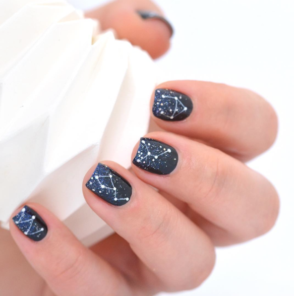 People are passionate about their horoscopes nowadays, so why not express themselves on their nails? Whether it represents your personal horoscope, other constellations, or astrology art as a tribute to someone else, these geometric, connected lines can be completed against the background of an inky black or dark blue sky and look surprisingly stylish.