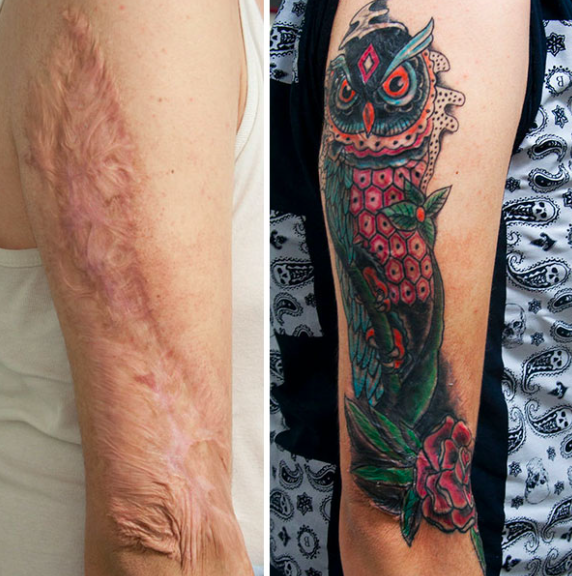 17. Beyond florals, this colorful and vibrant owl is an imaginative way to cover up a scar that takes up a large amount of real estate.