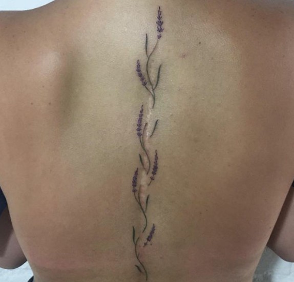 18. A scar down the back of the spine is turned into what looks like delicate wisps of lavender going from the lower back all the way up to the nape of the neck.