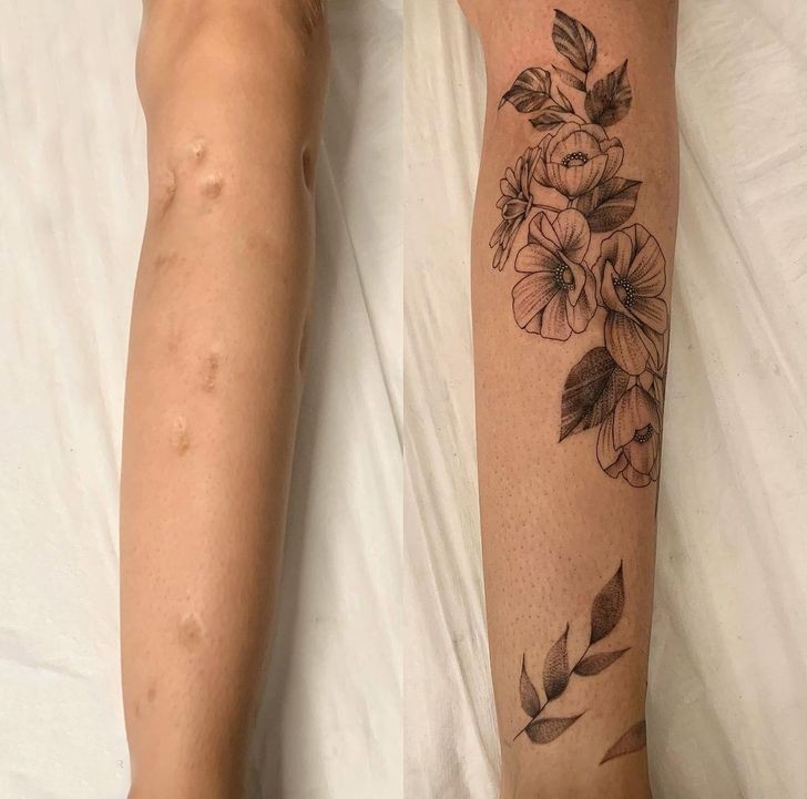 7. Another tattoo that’s proof that flowers and leaves with well-done shading are the best way to disguise scars.