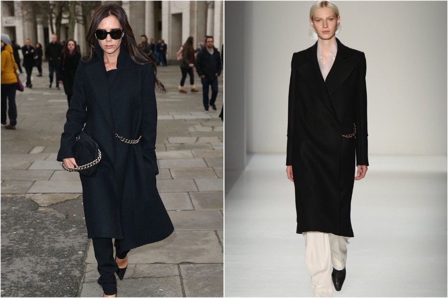 1. Here you can see Victoria wearing a black coat with chain detail right off the runway. Except she also paired it with a handbag that has the same chain on it for continuity and a put-together look.