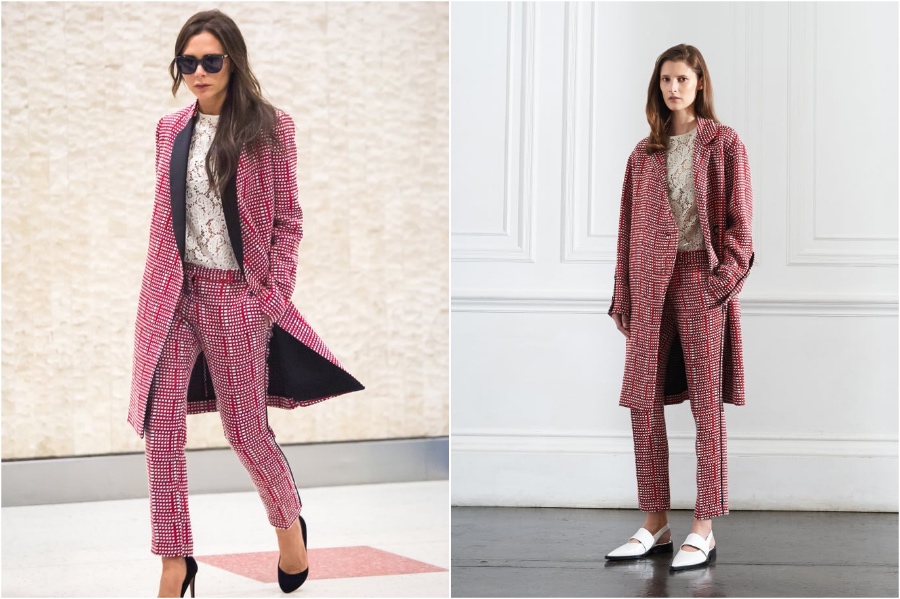 6. An almost identical outfit, except Victoria, went for a pop of red with that shirt collar instead of that neutral one for the runway.